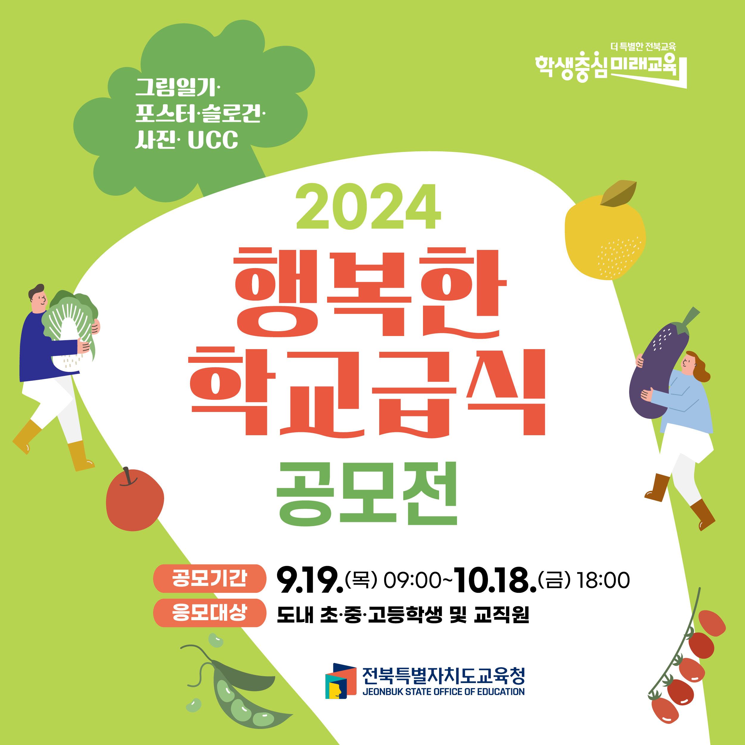 전북특별자치도교육청(교육감 서거석)은 ‘2024 행복한 학교급식 공모전’을 개최한다고 20일 밝혔다.